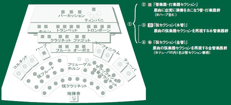 これは、ヒナ壇は管楽器パート、フロアは弦楽器パートと区分した上で、オーケストラと同じ配置を採用しているのです。ヒナ壇の奏者は原曲の「管楽器」パートを演奏。一方、フロアの奏者は見た目こそ管楽器ですが、内心は弦楽器になりきっており、弓のアップ・ダウン 、アルコとピチカートのニュアンスの差までマニアックに意識して演奏しているのです。(音にどの程度現れているかは別として)